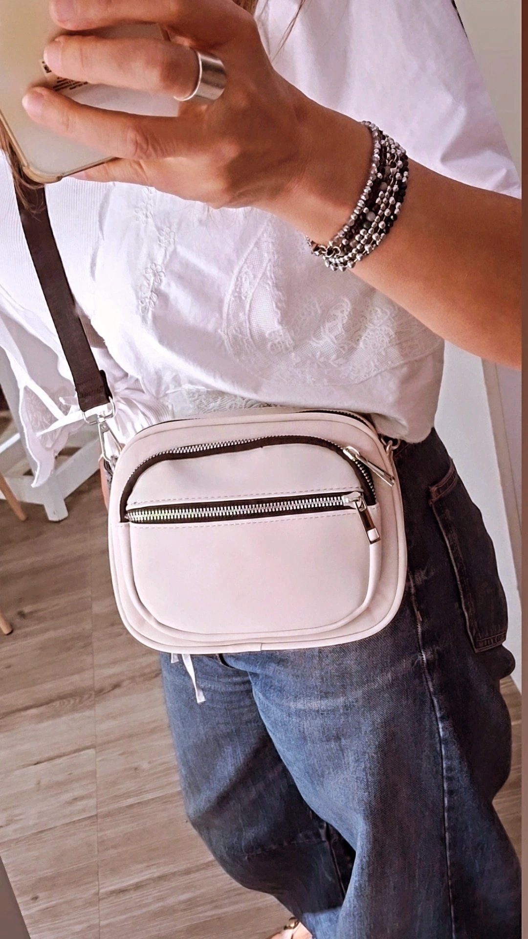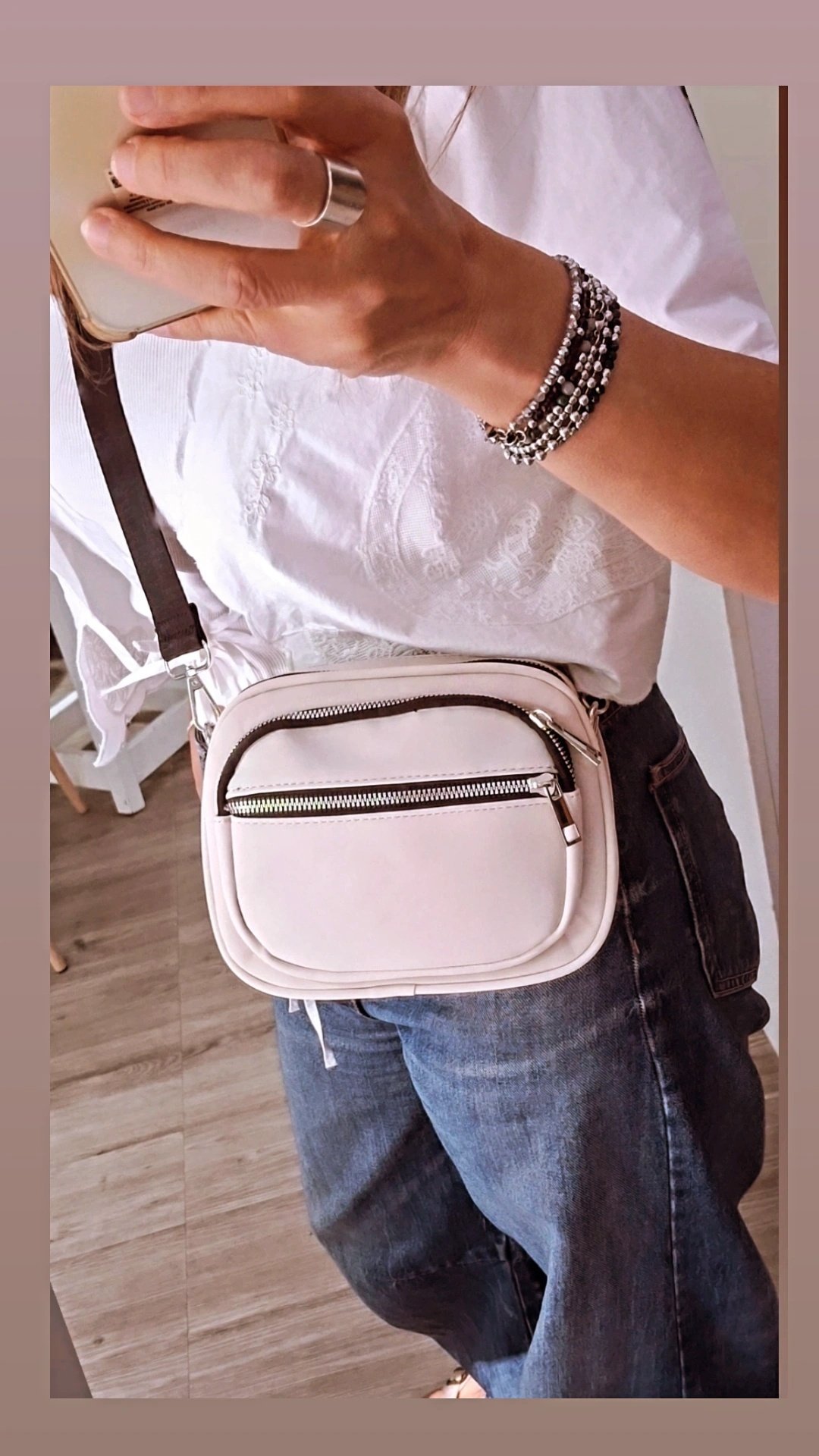Medida aprox. 25 x 14 cm. Fuelle 10 cm. Correa larga regulable. Bolsillos exteriores e interiores.